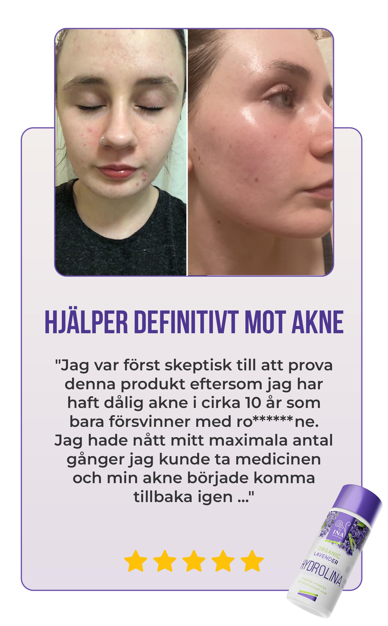from 603 reviewsJag har haft problem med akne och en ganska försvagad hudbarriär i flera år nu. Produkten doftar väldigt gott för mig. Den är inte för stark och torkar inte ut. Huden känns väl fuktad och len efter användning. På bilden ser du huden före (ovan) och 2 veckor efter (nedan) användning