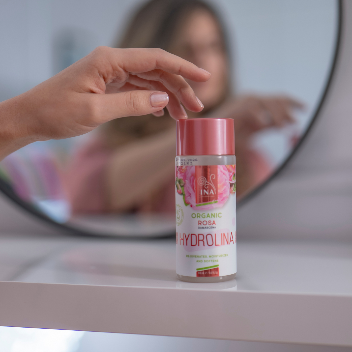 För optimala resultat, använd i kombination med InaEssentials’ Ekologiska Rosvatten – Hydrolina och Crème de Rose – en aktiv fuktkräm med SPF30 berikad med ekologisk rosolja för extra återfuktning och återuppbyggnad.