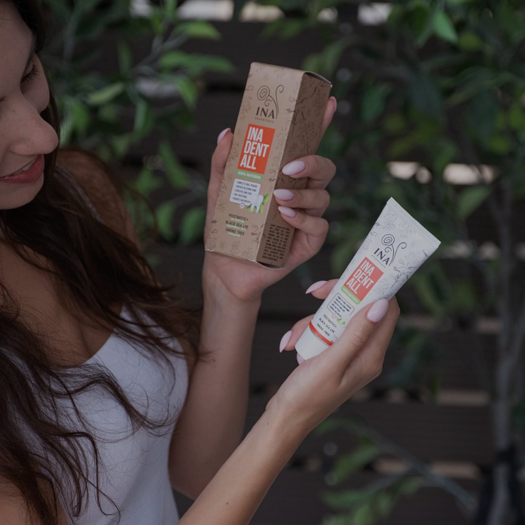 Ina Dent-All är berikat med en kraftfull kombination av naturliga ingredienser, inklusive extrakt från vild sumak, Pomorie-lut och postbiotika från mynta och sumak.